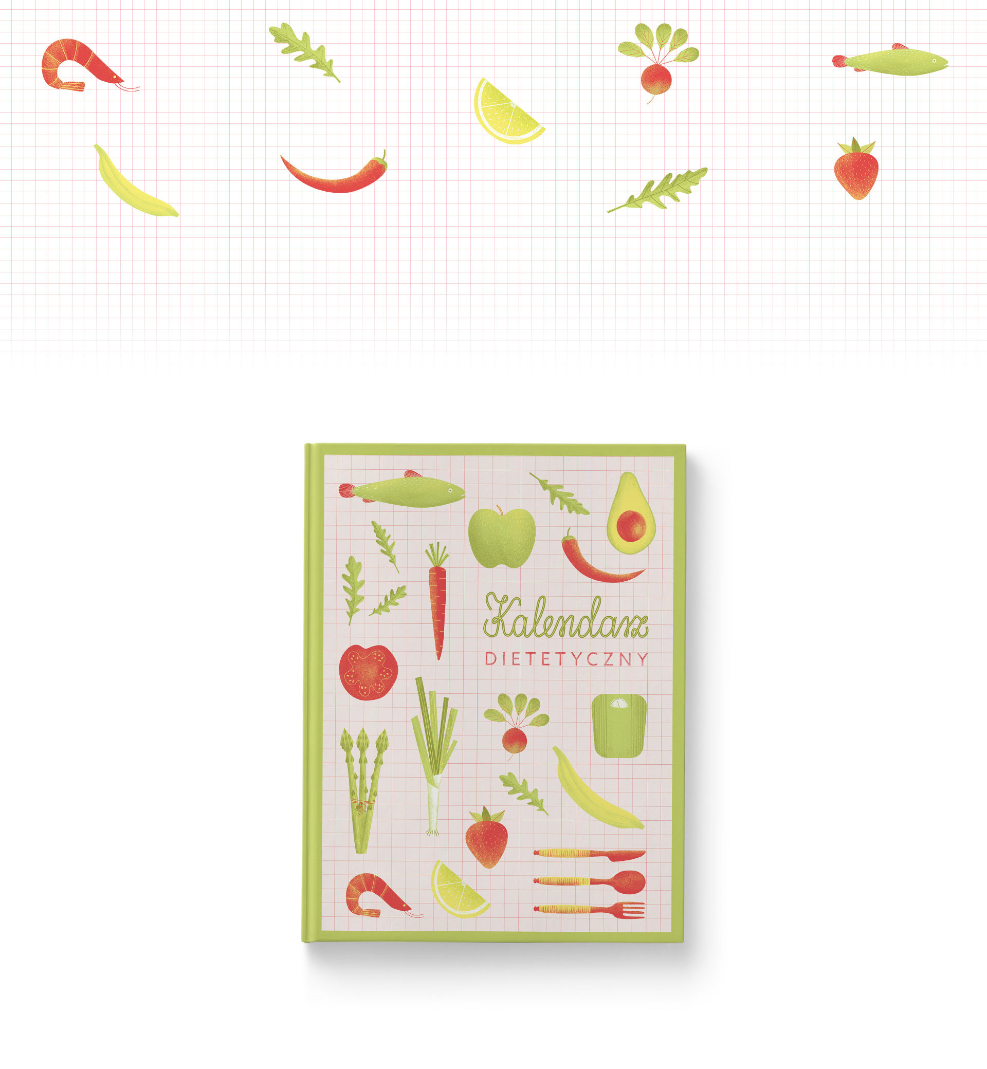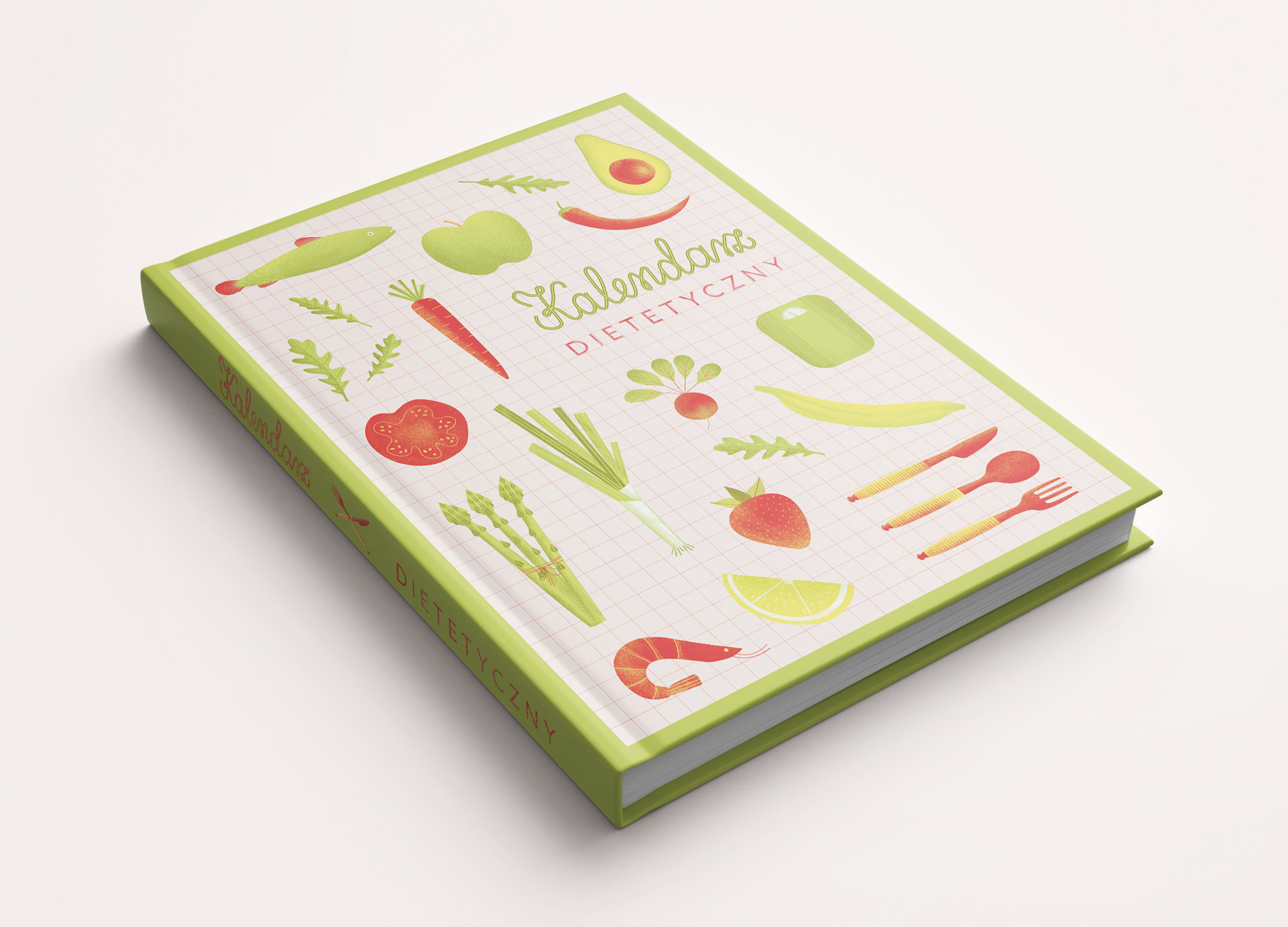 Ilustrowana okładka książki połączonej z kalendarzem, dotyczącej porad i wsparcia dla ludzi przebywających na diecie.