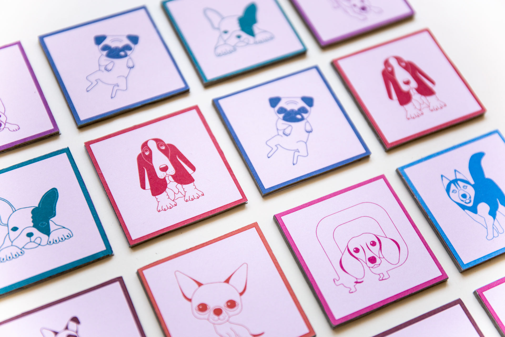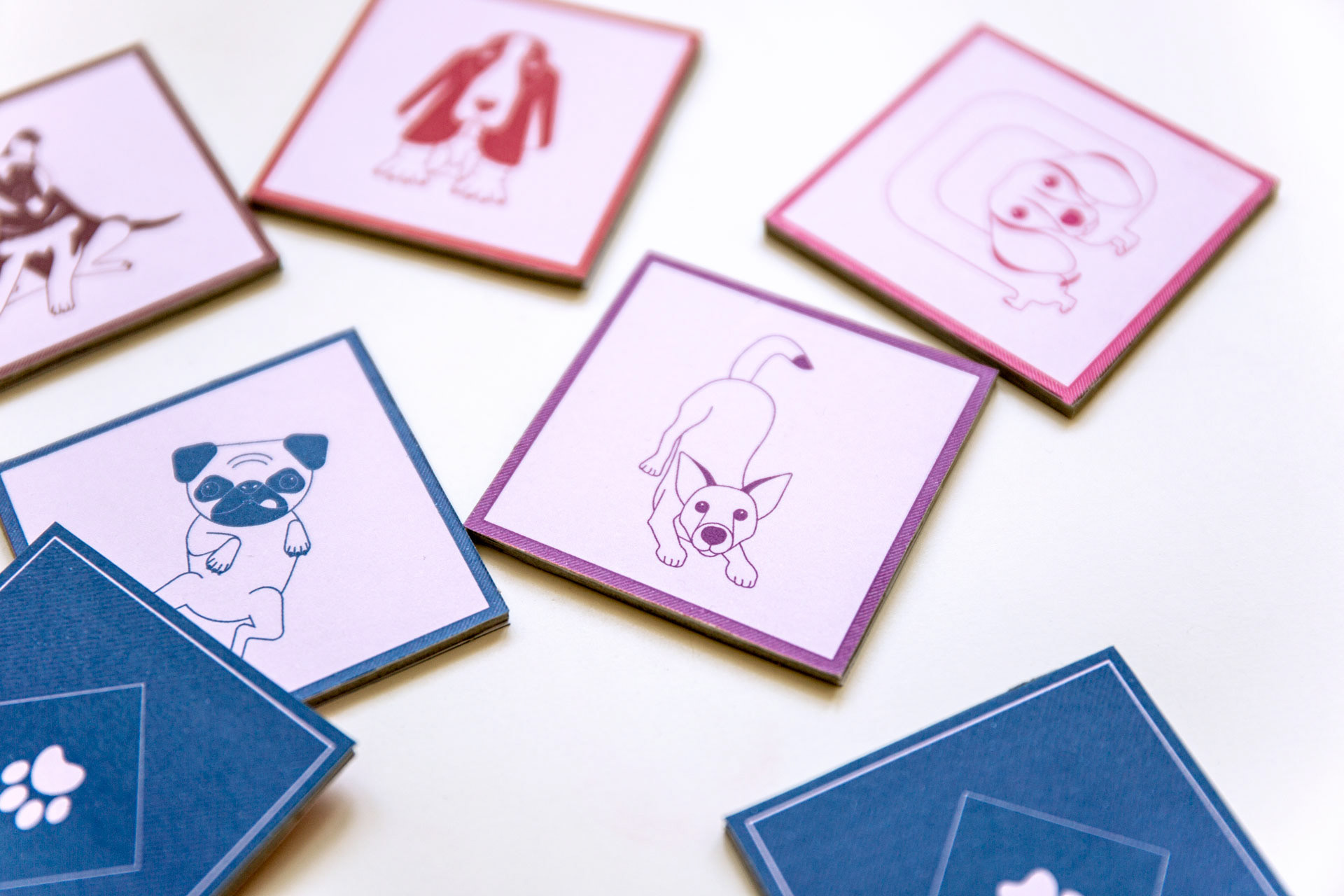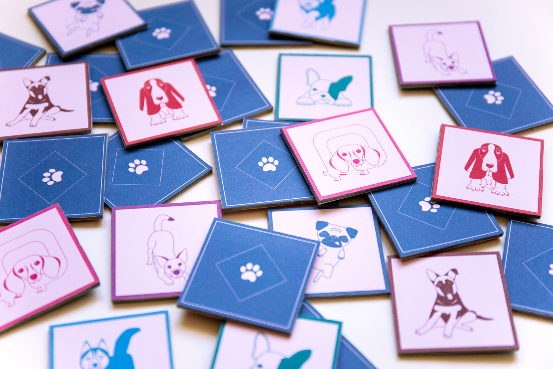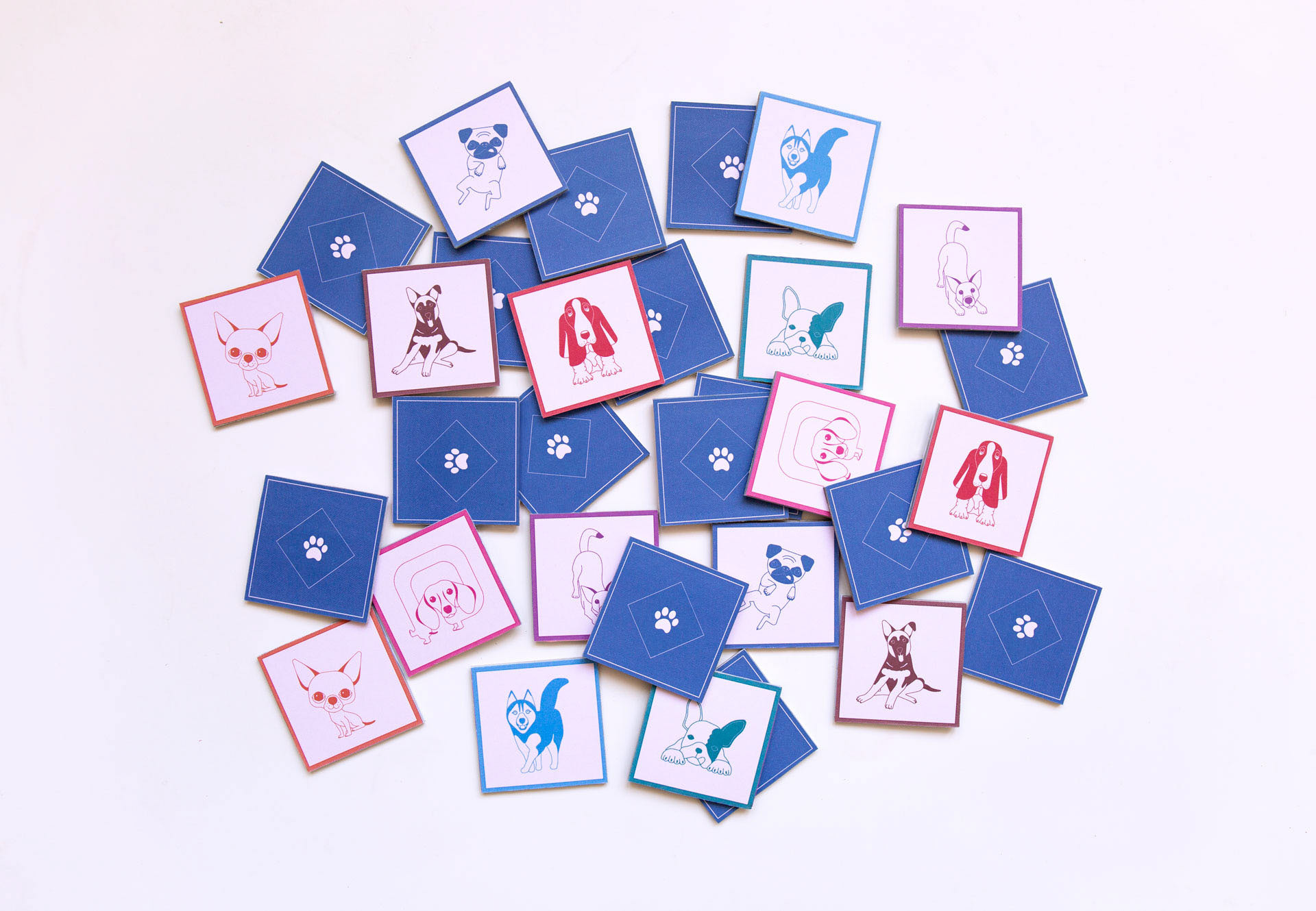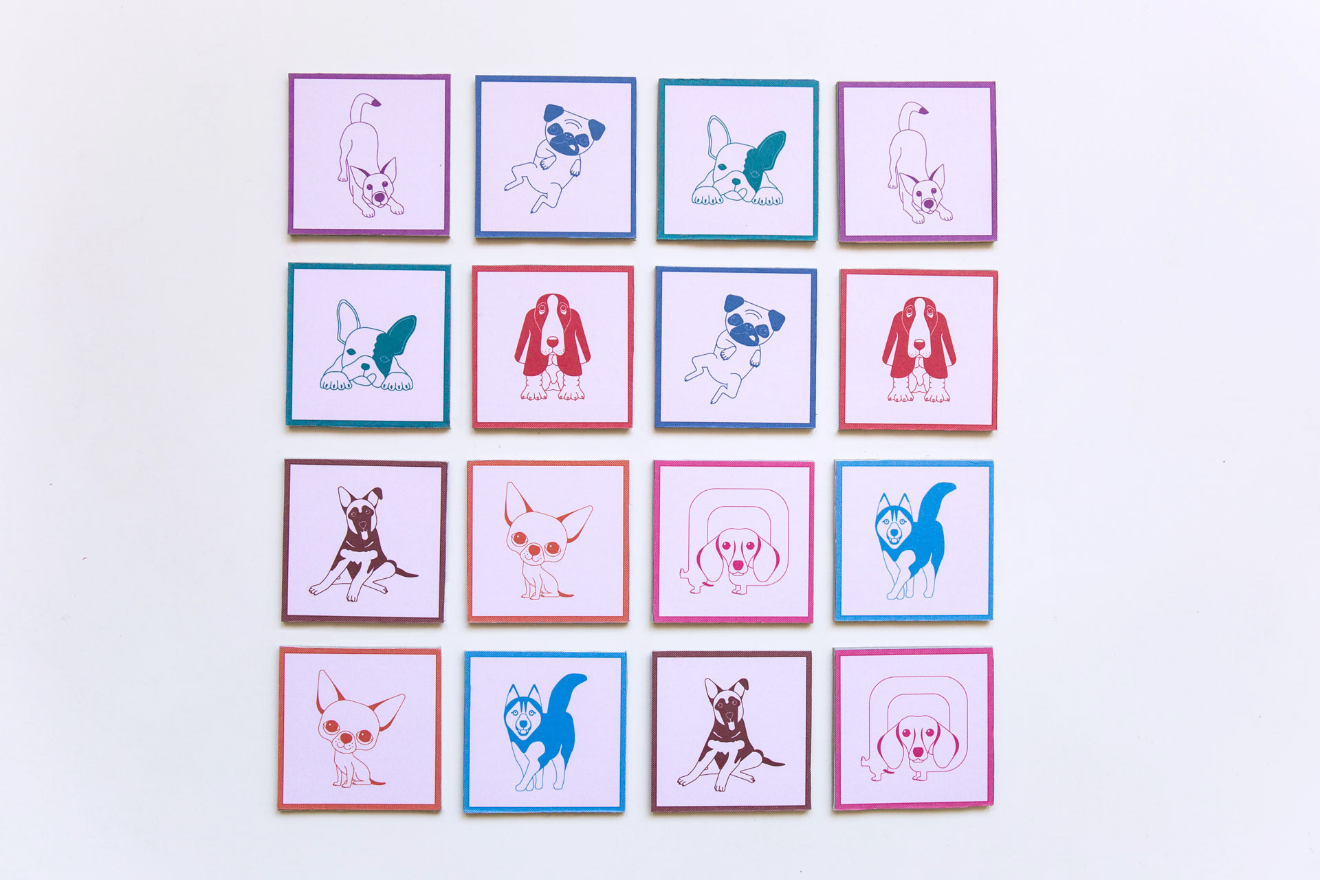 Projekt kart do gry w memory z ilustracjami przedstawiającymi psy.