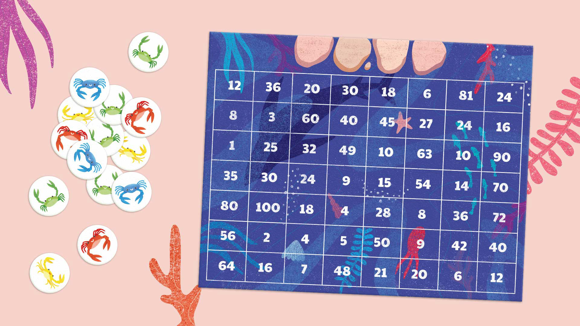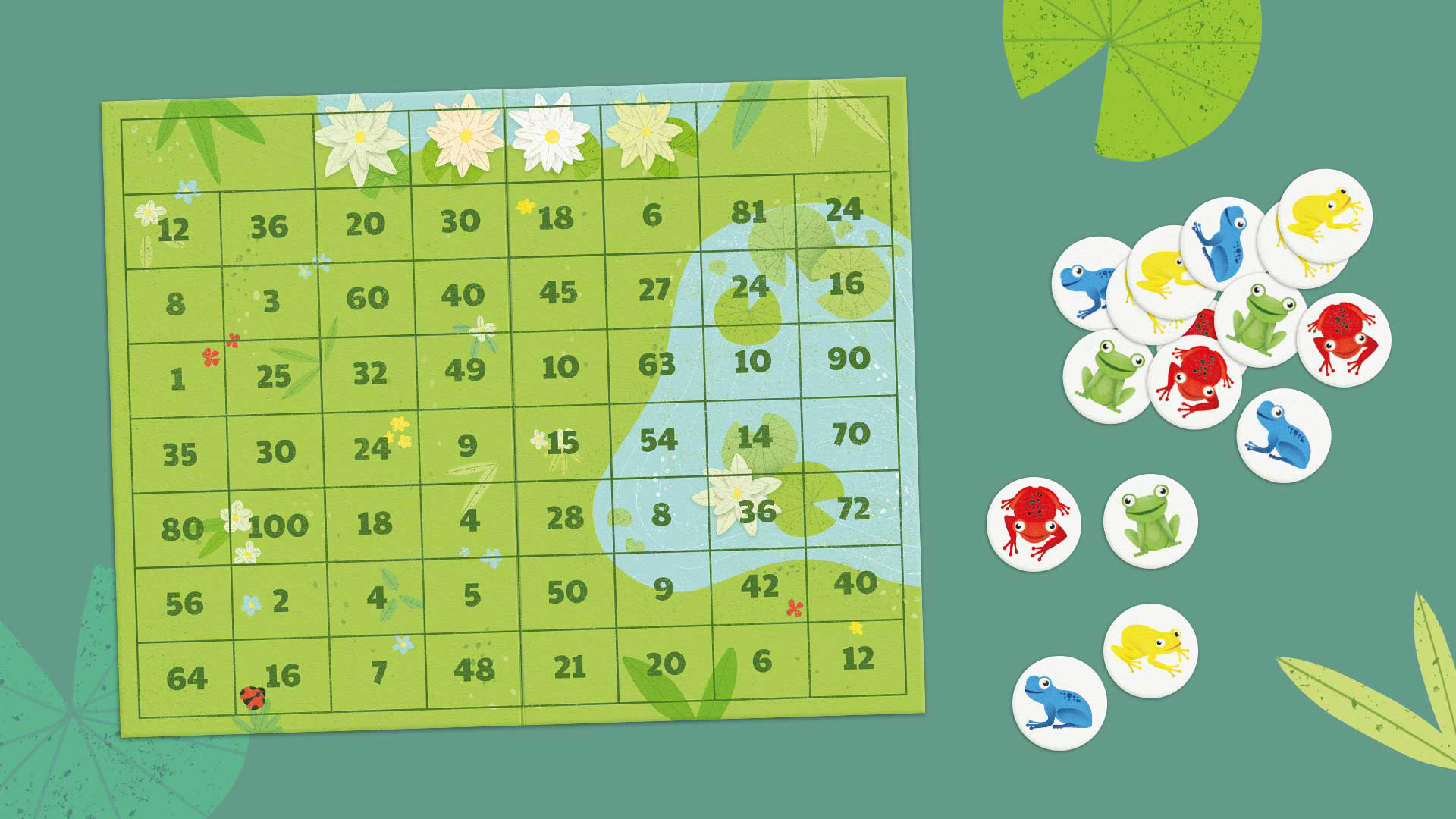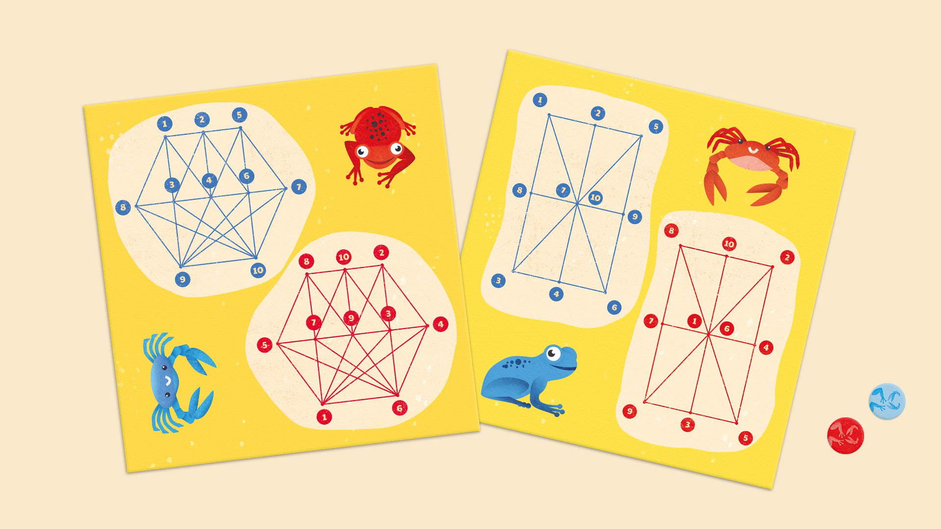 Ilustracje oraz projekt plansz i żetonów do gry edukacyjnej "Żaby czy kraby? Gra matematyczna na mnożenie" z serii Kapitan Nauka.