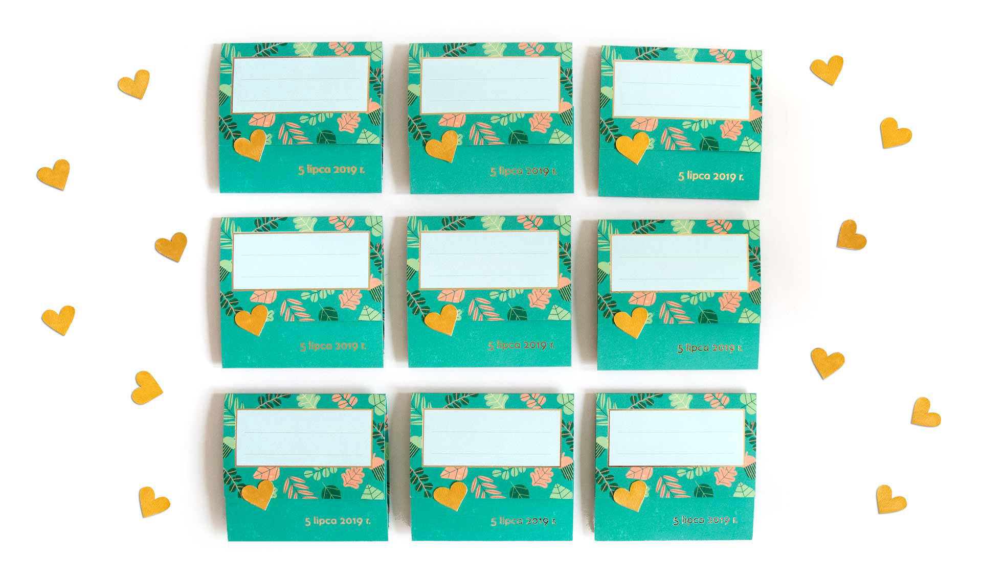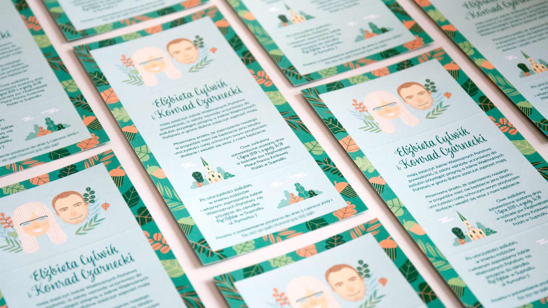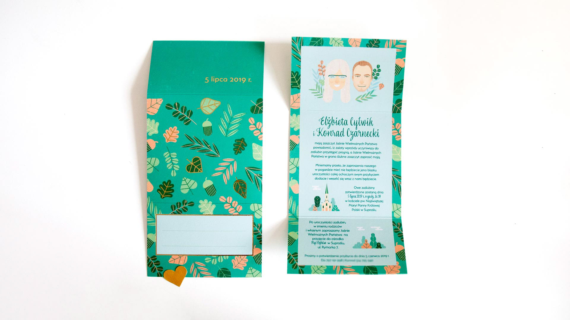 Zaproszenie ślubne Elżbiety i Konrada, uszlachetnione złotym hotstampingiem.