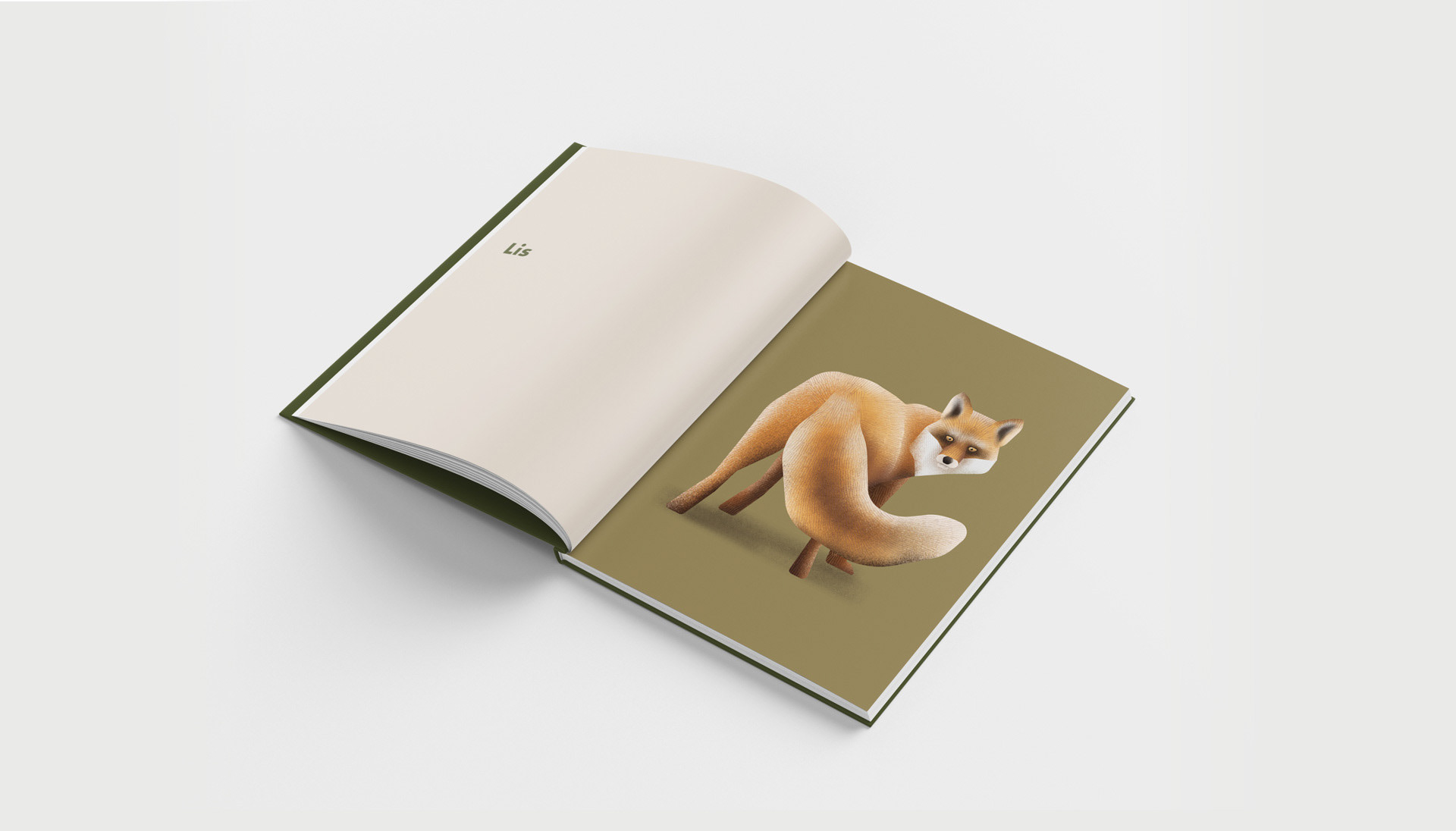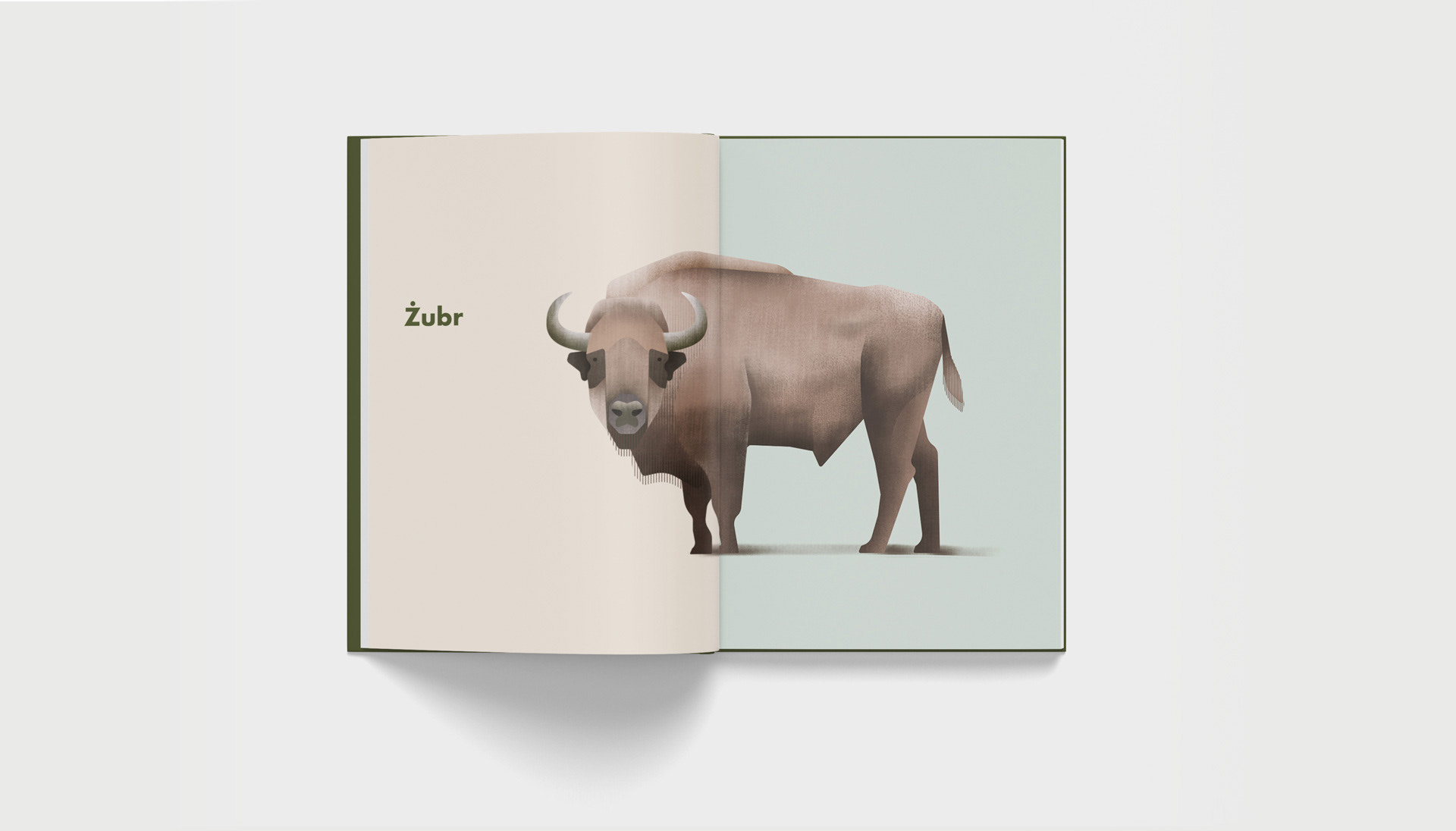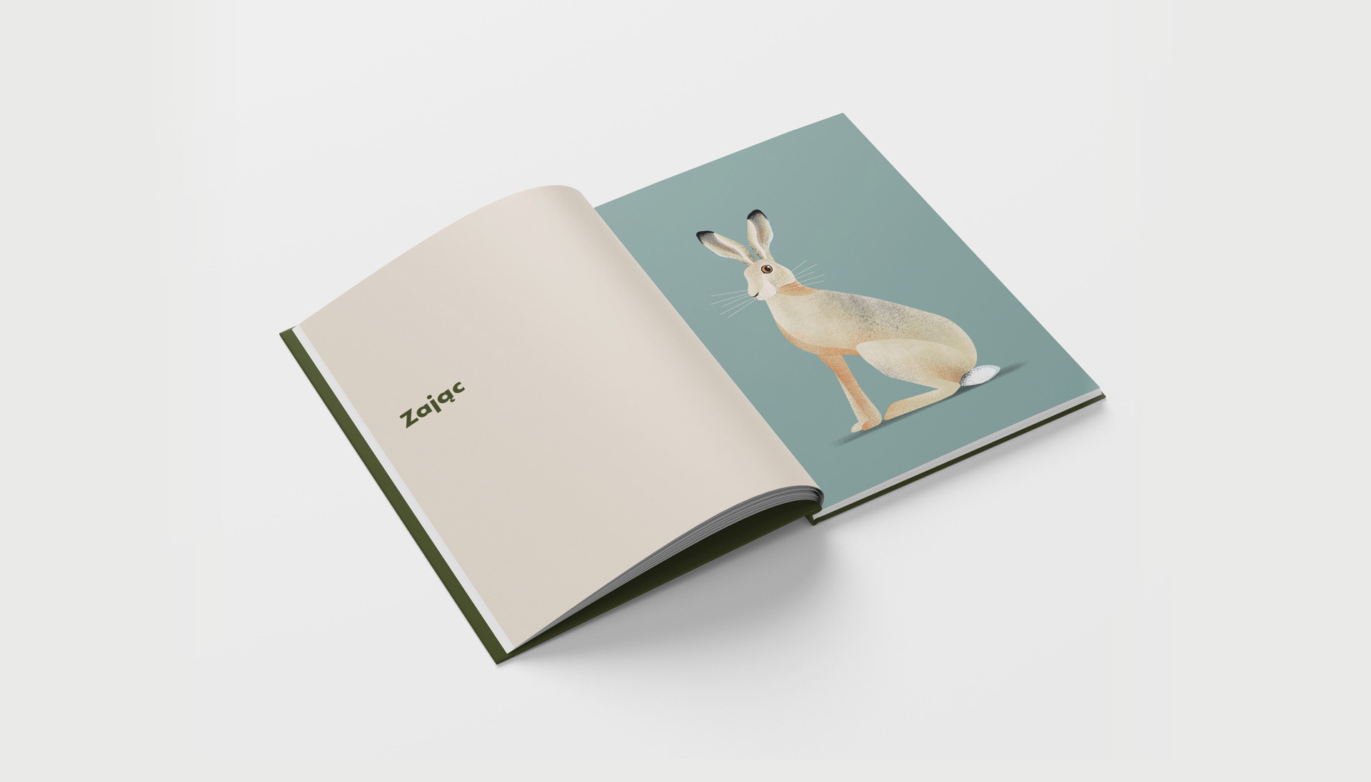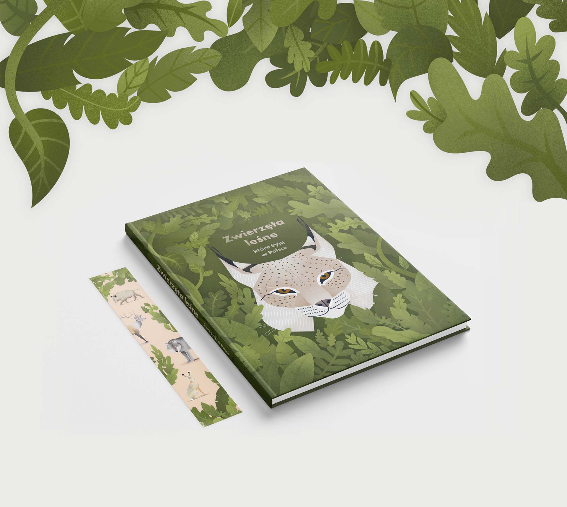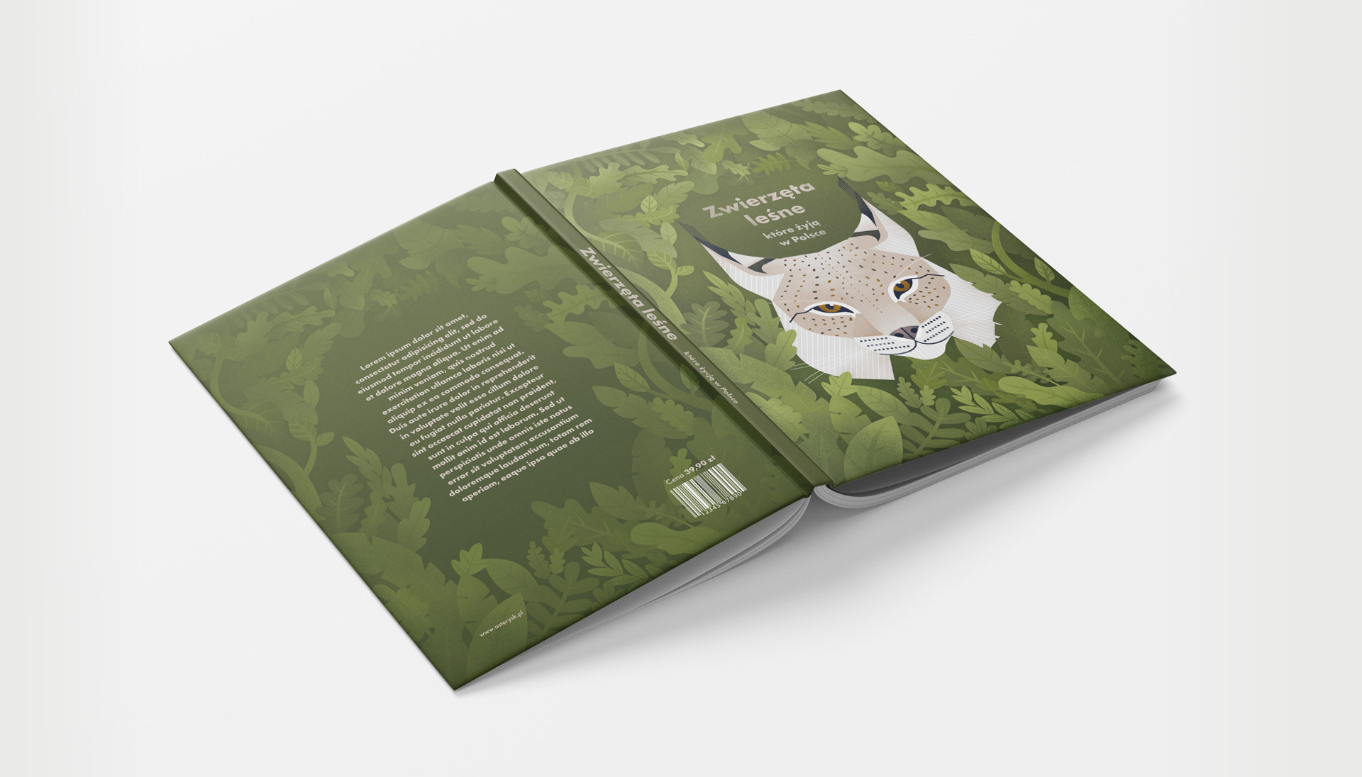 Okładka oraz ilustracje do książki prezentującej zwierzęta, które żyją w polskich lasach